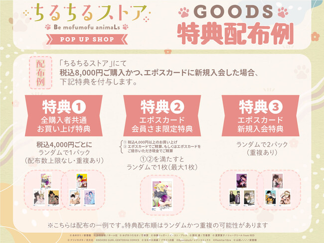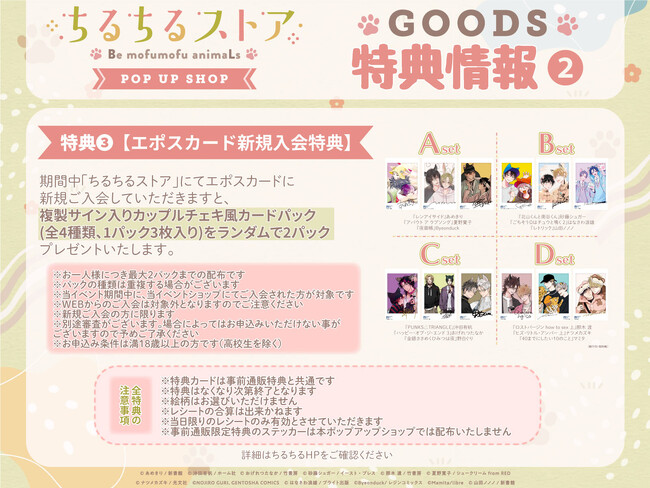期間中「ちるちるストア」にてエポスカードに新規ご入会していただきますと、複製サイン入りカップルチェキ風カードパック(全4種類、1パック3枚入り)をランダムで2パックプレゼントいたします。