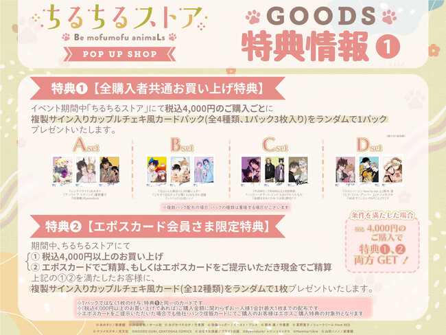 イベント期間中「ちるちるストア」にて税込4,000円のご購入ごとに複製サイン入りカップルチェキ風カードパック(全4種類、1パック3枚入り)をランダムで1パックプレゼントいたします。