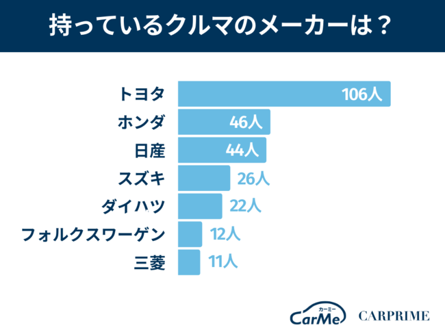 調査の結果、300名のうち106名(35.3%)がトヨタ車を所持しているという結果になりました。次に多かったのがホンダ(46名)、日産(44名)で、トヨタ車の半分以下です。