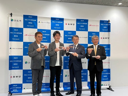 2024年11月8日(金)に浜松市内で開催し、自治体、メディア関係者などが参加しました。浜松市長 中野祐介氏、浜松いわた信用金庫理事長 高柳裕久氏、HarvestX 代表取締役 市川友貴氏、春華堂代表取締役 山崎貴裕が支援体制や製品導入の背景等についてお話ししました。
