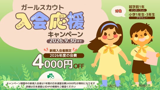 公益社団法人ガールスカウト日本連盟(会長:間 奈々恵、以下ガールスカウト日本連盟)は、2024年度・2025年度の2年間実施し、多くの反響をいただいている「入会応援キャンペーン(初年度会費無料)」を、2026年9月末まで延長することを決定いたしました。