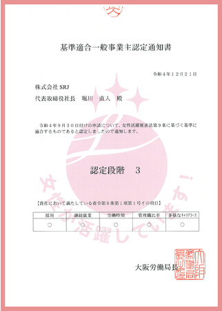 ICT教材の企画開発・販売を行なう株式会社SRJ(本社:東京都中央区、代表:堀川直人、以下「SRJ」)は、2022年12月21日付で、女性活躍推進法に基づく「女性の活躍推進に関する取り組みの実施状況などが優良な企業」として、「えるぼし認定」の最高位である 3つ星(3段階目)を取得いたしました。