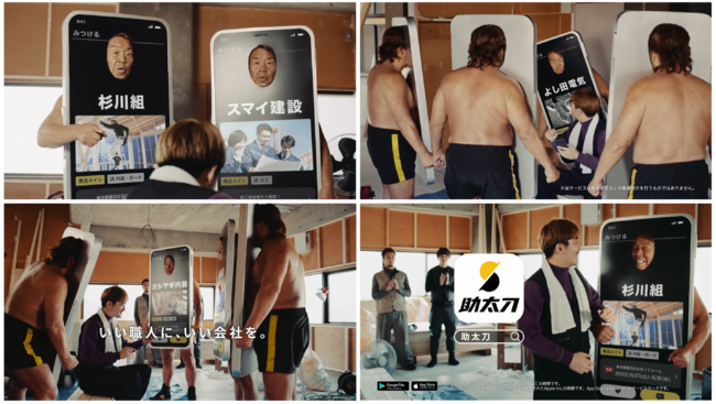 今回のCMでは、当社イメージキャラクターの長州力さんが、職人と工事会社の新しい出会いが見つかるマッチングサービス「助太刀」および、建設業特化の正社員採用サービス「助太刀社員」それぞれのサービスそのものになって登場し、職人さんの工事会社探しや、工事会社の職人さん探しをサポートします。