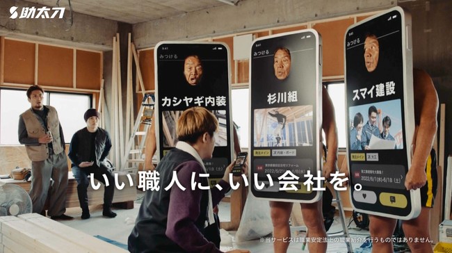 「助太刀」探す職人篇では「いい職人にいい会社を」というテーマで、新たな取引先を探す職人さんが助太刀を使って工事会社を探す様子を描いています。