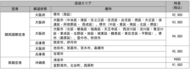 今後も高まっていくことが予想される観光需要に対応するため、関西国際空港からの送迎エリアには、京都府の9市町村に加えて、大阪府の8市と兵庫県の3市、那覇空港からの送迎エリアには、那覇市に加えて宜野湾市、北谷町、西原町の3つの地区を送迎エリアとして追加しました。