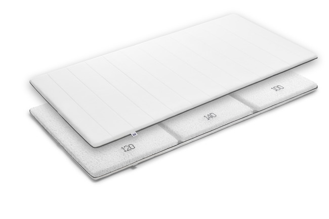 マットレスパッドは、エアファイバー(R)(中材)が3分割構造になっており、表裏で硬さが異なる3つのパーツを組み替えることで体形に合わせてカスタマイズすることができます。マットレスパッドの硬さは、4段階(柔らかめ・標準・硬め・とても硬め)で構成。軽いので、選手自身が簡単にカスタマイズすることができます。選手村のベッドマットレスの上に一枚重ねて敷くだけで理想的な寝姿勢を保つことができ、睡眠中の身体への負担を軽減します。