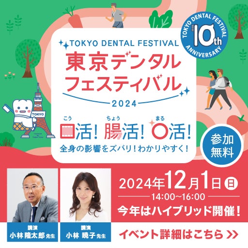 東京デンタルフェスティバルは本年度ハイブリッド方式で開催いたします。今回のテーマは「口活!腸活!〇活!全身の影響をズバリ!わかりやすく!」です。日本歯科大学東京短期大学 学長 小林 隆太郎先生から「これからのライフステージのために ~口活!「口腔健康管理」のチカラ~」、小林メディカルクリニック東京 理事長・院長 小林 暁子先生から「全身の細胞の質を上げる腸活と口活の大切なポイント!」をテーマとして、ご講演いただきます。