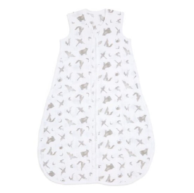 足まですっぽりと包み込む寝袋状のスリーピングバッグ。就寝時の寝冷えを防ぎます。おむつ替えも考慮した足元ファスナー付きです。サイズ:M(6~18か月まで)、身長66~86cm、体重7~13kg (コットンモスリン素材のスリーピングバッグとは対象月齢・着丈が異なります)