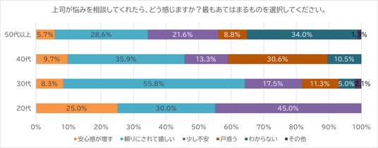 「安心感が増す」10.0%、「頼りにされて嬉しい」40.7%となり、約半数(50.7%)が上司からの悩み相談を前向きに受け止めていることがわかりました。一方で、「少し不安」13.6%、「戸惑う」14.0%と、ネガティブな反応も計27.6%みられます。また「わからない」20.8%という結果から、日常的に上司から相談される経験が少ない層や、相談の意図が伝わりにくい状況も一定数あることが示唆されます。