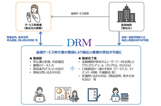 DRMは、長年のアウトバウンドコールセンターの運営業務で培った、高い営業力やコミュニケーション能力、高度なオペレーション体制を強みとして、近年は、金融機関向けに、顧客接点に関わる様々な業務や、バックオフィス業務等のBPOサービスを提供してきました。この度、DRMが金融サービス仲介業登録を受けたことにより、金融分野における受託可能業務の範囲が拡大しました。クライアント金融機関の非コア業務を幅広くワンストップで請け負うことにより、人手不足解消や業務集約による社内リソースの最適化に貢献いたします。
