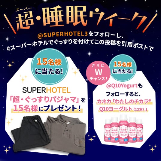 スーパーホテルオリジナルの「超・ぐっすりパジャマ」や、カネカの「わたしのチカラ(R) Q10ヨーグルト」が抽選で当たるキャンペーンをXで開催します。