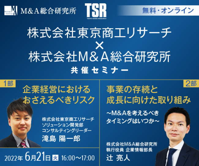 株式会社M&A総合研究所(本社:東京都千代田区、代表取締役社長:佐上 峻作、以下「当社」)は、2022年6月21日(火)に、東京商工リサーチとの共催セミナー「企業経営を取り巻くリスクにどう向き合うか~M&Aによる事業の存続と成長に向けた取り組み~」を実施することをお知らせいたします。
