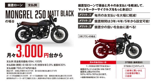 ピーシーアイ株式会社(代表取締役社長:高橋一穂)は、大手信販会社ジャックスと提携し、新たにマットモーターサイクルズを購入する方のために、資金計画やライフプランに合わせて2種類のローンプランから選択していただける「マットモーターサイクルズ・ライダースローン」(ジャックス)の提供を開始いたしました。