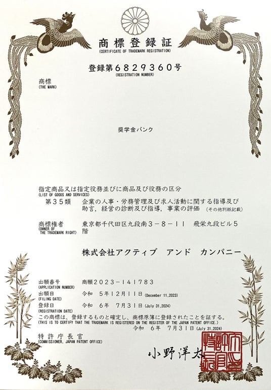 株式会社アクティブ アンド カンパニー(本社:東京都千代田区、代表取締役社長兼CEO:大野順也)は、当社の奨学金返還支援サービス「奨学金バンク」に関して、この度、商標登録が完了したことをお知らせいたします。