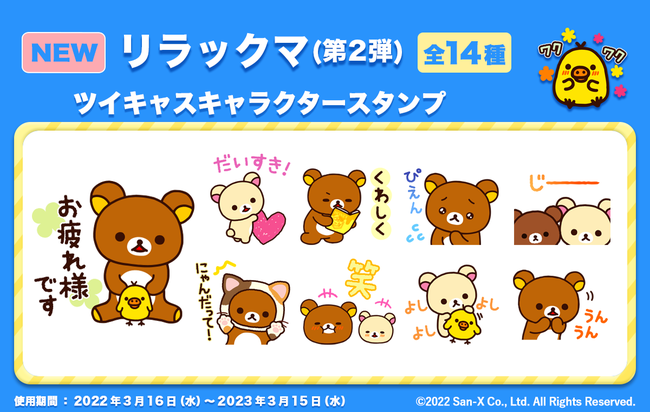 モイ株式会社(本社:東京都千代田区 代表:赤松 洋介)は、同社が運営するライブ配信サービス「ツイキャス」において、『リラックマ』のキャラクタースタンプ第2弾を導入したことをお知らせいたします。