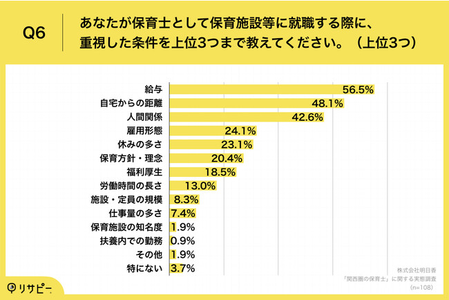 「Q6.あなたが保育士として保育施設等に就職する際に、重視した条件を上位3つまで教えてください。(上位3つ)」(n=108)と質問したところ、「給与」が56.5%、「自宅からの距離」が48.1%、「人間関係」が42.6%という回答となりました。