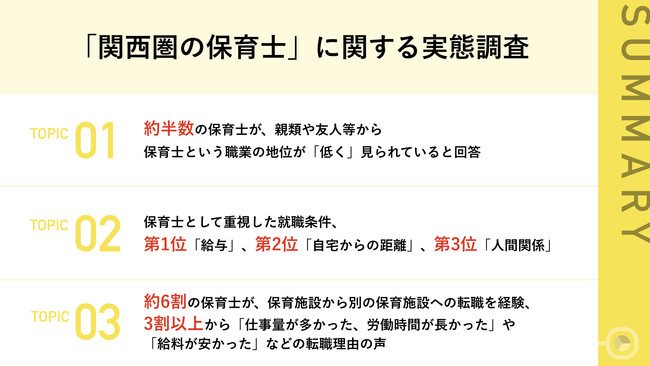 結果として、関西圏の現役保育士の約半数が、親類や友人等の周りから保育士という職業の地位が「低く」見られていると感じている実態が明らかになりました。これは東海三県の調査結果(※)と同様の結果となり、保育士という職業への世間のイメージが共通しているようです。