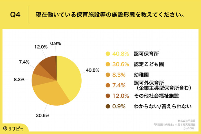 「Q4.現在働いている保育施設等の施設形態を教えてください。」(n=108)と質問したところ、「認可保育所」が40.8%、「認定こども園」が30.6%という回答となりました。