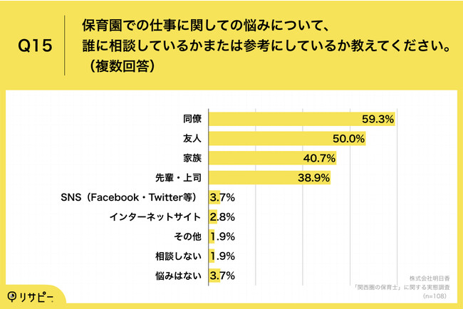 「Q15.保育園での仕事に関しての悩みについて、誰に相談しているかまたは参考にしているか教えてください。(複数回答)」(n=108)と質問したところ、「同僚」が59.3%、「友人」が50.0%、「家族」が40.7%という回答となりました。