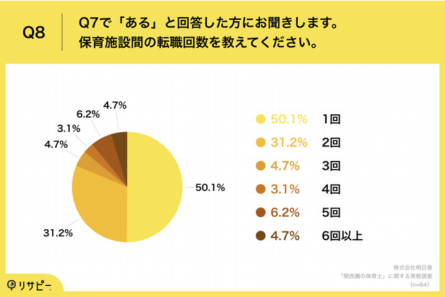 Q7で「ある」と回答した方に、「Q8.保育施設間の転職回数を教えてください。」(n=64)と質問したところ、「1回」が50.1%、「2回」が31.2%という回答となりました。