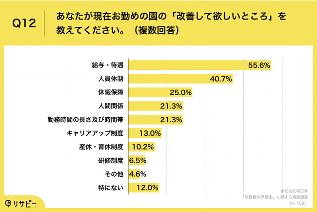 「Q12.あなたが現在お勤めの園の「改善して欲しいところ」を教えてください。(複数回答)」(n=108)と質問したところ、「給与・待遇」が55.6%、「人員体制」が40.7%、「休暇保障」が25.0%という回答となりました。