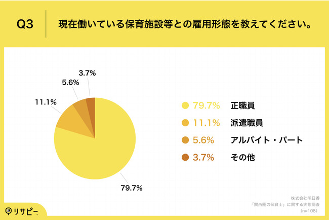「Q3.現在働いている保育施設等との雇用形態を教えてください。」(n=108)と質問したところ、「正職員」が79.7%、「派遣職員」が11.1%という回答となりました。