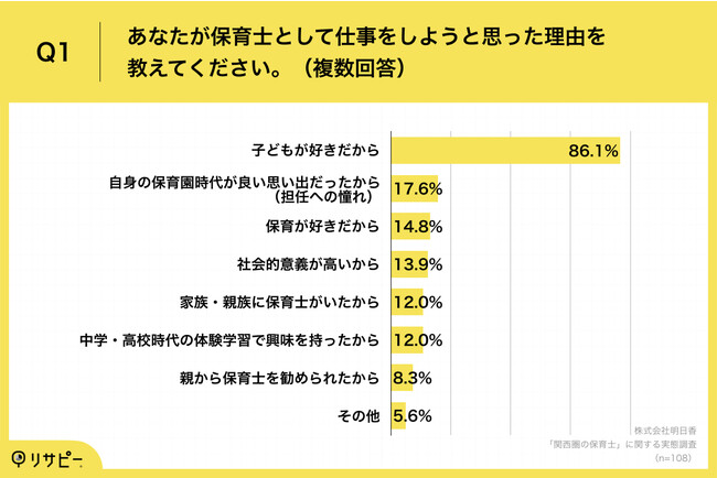 「Q1.あなたが保育士として仕事をしようと思った理由を教えてください。(複数回答)」(n=108)と質問したところ、「子どもが好きだから」が86.1%、「自身の保育園時代が良い思い出だったから(担任への憧れ)」が17.6%、「保育が好きだから」が14.8%という回答となりました。