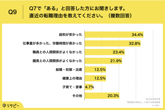 Q7で「ある」と回答した方に、「Q9.直近の転職理由を教えてください。(複数回答)」(n=64)と質問したところ、「給料が安かった」が34.4%、「仕事量が多かった、労働時間が長かった」が32.8%、「職員との人間関係がよくなかった」が23.4%という回答となりました。