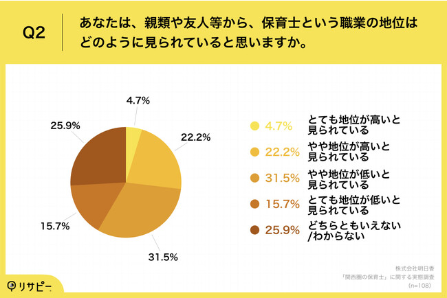 「Q2.あなたは、親類や友人等から、保育士という職業の地位はどのように見られていると思いますか。」(n=108)と質問したところ、「やや地位が低いと見られている」が31.5%、「とても地位が低いと見られている」が15.7%という回答となりました。