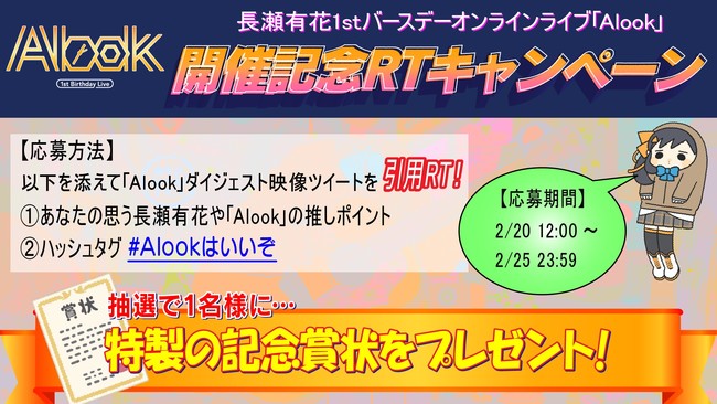 RTキャンペーンでは長瀬有花のTwitetrに上げられたダイジェスト動画のツイートに、見どころや感想をハッシュタグ「#Alookはいいぞ」と供に引用RTすることで参加が可能となっており、抽選で選ばれたファンには「記念賞状」がプレゼントされる。