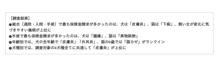 犬の総合ランキングでは、昨年に引き続き「皮膚炎」が第1位となりました。「皮膚炎」は、過去の調査*³において「5人に1人が皮膚トラブルで請求している」という結果もでており、多くの飼い主が経験している身近な傷病です。また、第1位の「皮膚炎」、第2位の「外耳炎」は、かゆみのために身体を掻く、頭を振るなどの仕草や、皮膚・耳の赤みなどの症状が表れることがあります。さらに、第3位の「胃腸炎」、第4位の「下痢」も普段とは違う便が出るなど、飼い主が変化に気づきやすい傷病が上位を占めました。