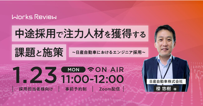 株式会社ワークス・ジャパン(本社:東京都千代田区、代表取締役:清水信一郎、以下 ワークス・ジャパン)は、2023年1月23日(月)に採用業務に従事する部門のご担当者様を対象にしたオンラインセミナー「中途採用で注力人材を獲得する課題と施策~日産自動車におけるエンジニア採用~」を開催します。