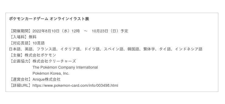 株式会社ポケモン(東京都港区、代表取締役社長:石原恒和)は、2022年8月10日(水)より「ポケモンカードゲームオンラインイラスト展」を開催いたします。