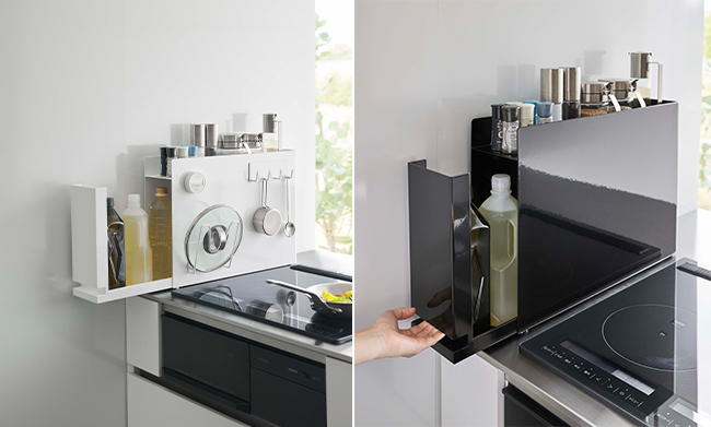 引き出し式で、油のボトル類も収納できる大容量の調味料ラック。