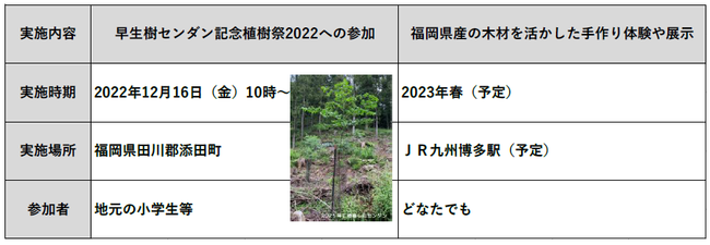 本プロジェクトは、JR九州様と連携することで現在福岡県としても力を入れている早生広葉樹であるセンダンを活用したプロジェクトです。センダンの木を植樹して成木なるまで大切に育て、大川市で製材、加工するにあたり一般社団法人大川スタンドバイツリー様にご協力いただいています。
