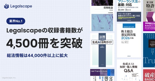 株式会社Legalscape(本社:東京都文京区、代表取締役社長・最高経営責任者:八木田 樹、以下リーガルスケープ)は、は、リーガルリサーチプラットフォーム「Legalscape(リーガルスケープ)」の収録書籍数が4,500冊を突破したことをお知らせします。