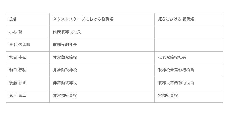 日本ビジネスシステムズ株式会社(本社︓東京都港区 代表取締役社長︓牧田幸弘 以下、JBS)は、本日開催の取締役会において、子会社である株式会社ネクストスケープ(以下、ネクストスケープ)の人事を下記の通り決定したことをお知らせします。