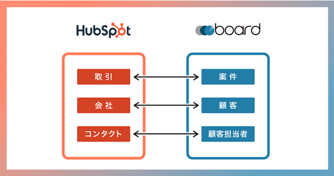 HubSpot連携機能を使うと、boardの案件・顧客・顧客担当者と、HubSpotの取引・会社・コンタクトを相互に連携できます。