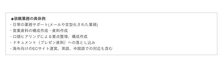 事業内容 :バックオフィス系の業務(人事、経理、営業事務、資料作成など)をオンラインでアウトソーシングとして請ける「HELP YOU」の展開。業務仕分けコンサルティング、テレワークの研修・コンサルティング、コスト最適化サービスも実施。