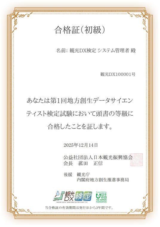 公益社団法人日本観光振興協会(東京都港区 会長 菰田正信(三井不動産(株)代表取締役会長))は、観光庁、内閣府地方創生推進事務局後援のもと2025年12月14日に実施いたしました「第1回地方創生データサイエンティスト検定試験(初級)」の合格者を下記のとおり発表いたしました。