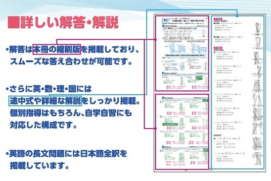 ◇ 「解答」は本冊の縮刷版、「英・数・理・国」には途中式や詳細な解説をしっかり掲載しています。