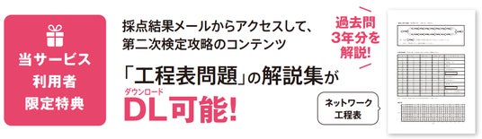 「即日採点サービス」をご利用いただいた方限定で、第二次検定の試験対策に役立つ「工程表問題」の解説をまとめた資料集(過去3年分)をプレゼントいたします。即日採点サービスの返信メールに記載されているURLよりダウンロードできます。