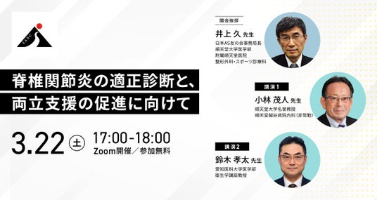 株式会社Medii(本社:東京都新宿区、代表取締役医師 山田裕揮、以下「Medii」)は、日本AS友の会(指定難病271強直性脊椎炎の患者会)と協力し、医師向けWeb講演会「脊椎関節炎の適正診断と、両立支援の促進に向けて」を3月22日(土)に開催いたします。