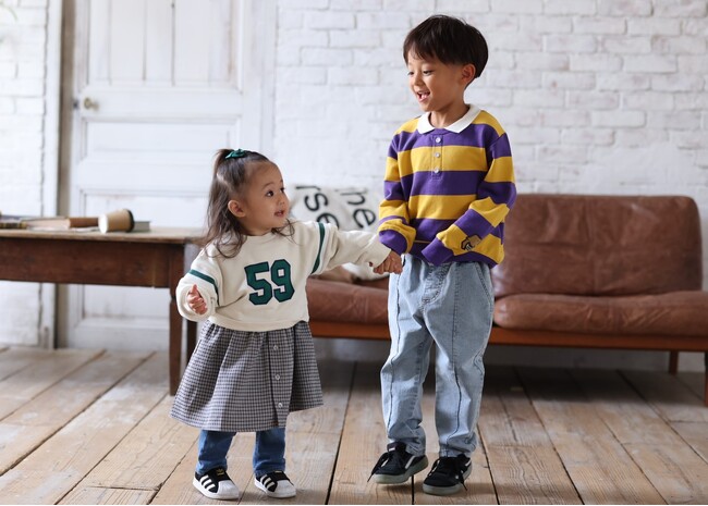 今回のコレクションのポイント1つ目は、デザインだけではなく利便性も兼ねていること。お子様1人でも着れる着やすさやご家庭の洗濯機でも洗えるニットなどママにも喜んでもらえる企画になっています。2つ目に男女兼用デザイン。6アイテムのうち4アイテムが男女兼用のデザインとなっており、兄弟姉妹だけではなく、男の子・女の子でもお揃いコーディネートができるという、兄妹の母である宮城 舞さんならではのファッションへの情熱と思いが込められています。