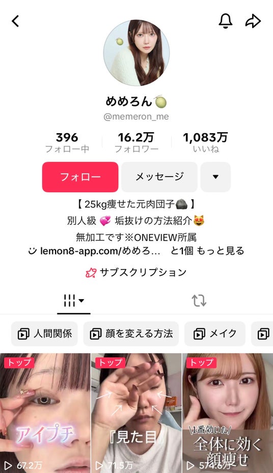 めめろんは、2020年よりTikTokを中心に、自身のダイエット経験を基にした動画投稿を開始しました。現在はメイク、スキンケア、ファッション、ライフスタイルなど多岐にわたる美容情報を発信。TikTokでは再生回数2,000万回を超えるコンテンツを複数創出など、「自分を変えたい」と願うZ世代を中心に絶大な支持を集めています。