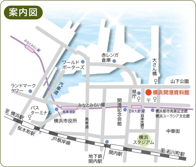 JR桜木町駅から市営バス「日本大通り駅県庁前」下車、徒歩1分。