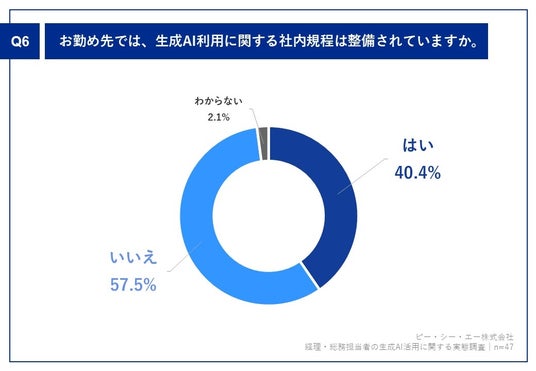 Q1で「毎日活用している」「たまに活用している」と答えた方に、「Q6.お勤め先では、生成AI利用に関する社内規程は整備されていますか。」(n=47)と質問したところ、「はい」が40.4%、「いいえ」が57.5%という回答となりました。