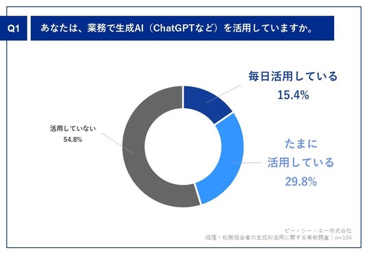 「Q1.あなたは、業務で生成AI(ChatGPTなど)を活用していますか。」(n=104)と質問したところ、「毎日活用している」が15.4%、「たまに活用している」が29.8%という回答となりました。