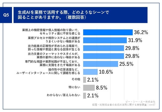 Q1で「毎日活用している」「たまに活用している」と答えた方に、「Q5.生成AIを業務で活用する際、どのようなシーンで困ることがありますか。(複数回答)」(n=47)と質問したところ、「業務上の機密情報や個人情報の取り扱いで、セキュリティ面に不安を感じる」が36.2%、「業務プロセスや既存システムとの連携がうまくいかない場面がある」が31.9%という回答となりました。