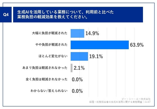 【Q4】 約8割が、生成AI活用により「業務負担が軽減された」と回答